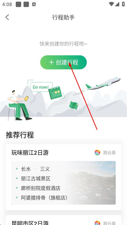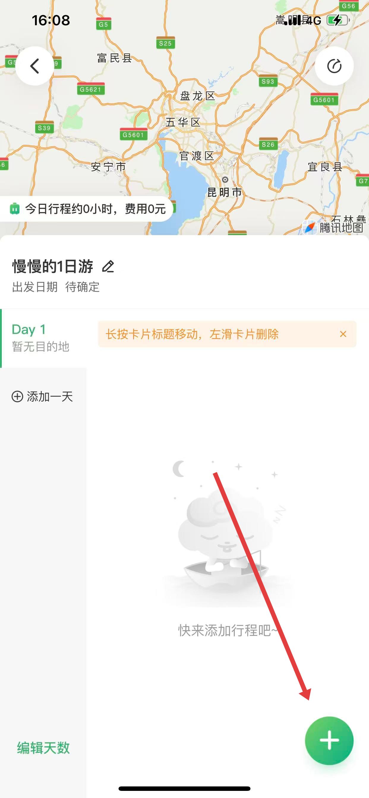 3、进入创建行程页面后,点击右下方绿色的+号按钮。