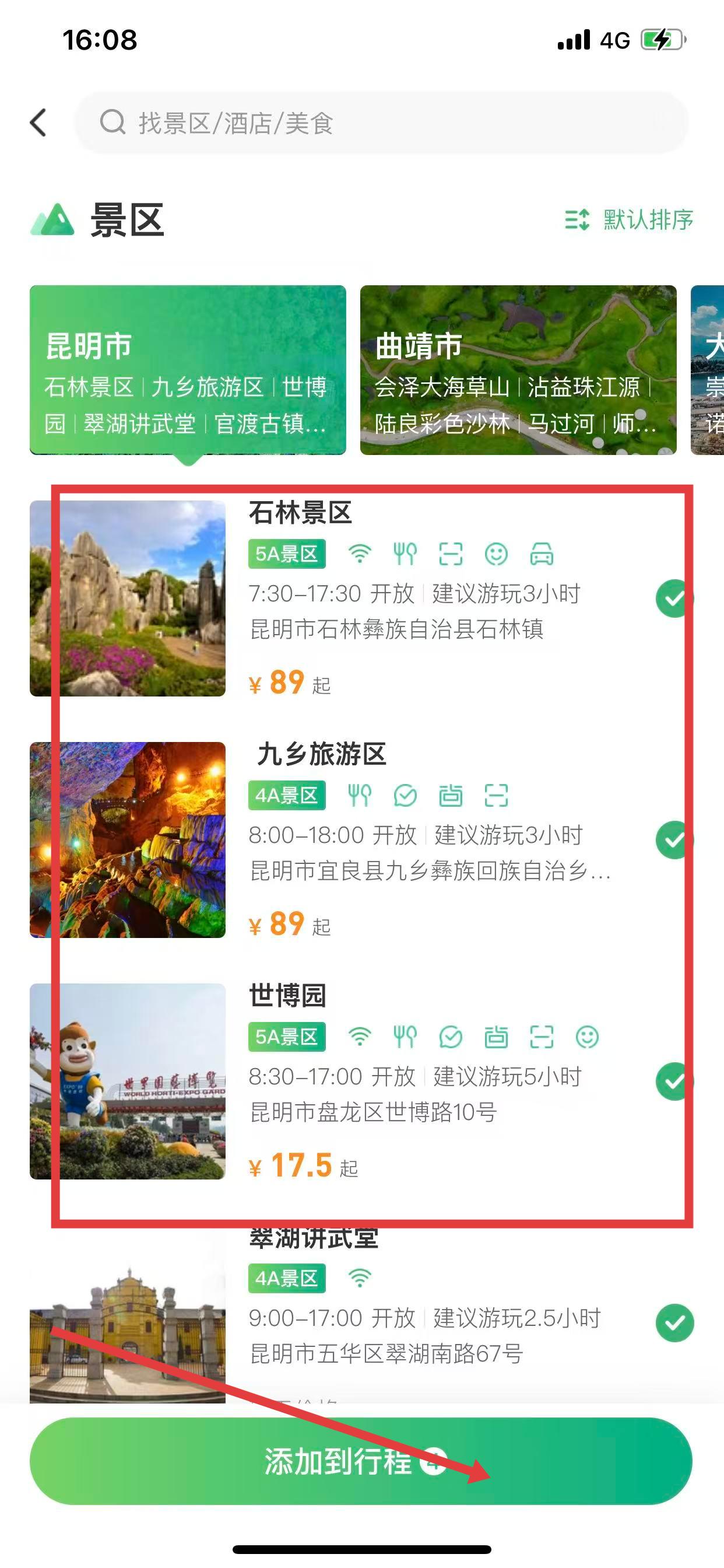 5、选择想要添加到行程中的景区,选中景区后,点击添加到行程。