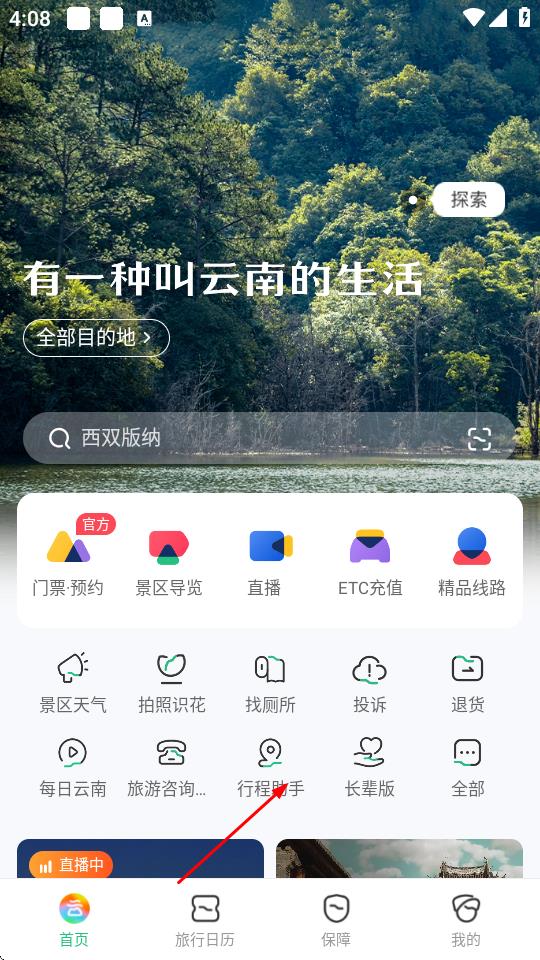 1、打开“游云南”APP,进入首页,点击行程助手选项。