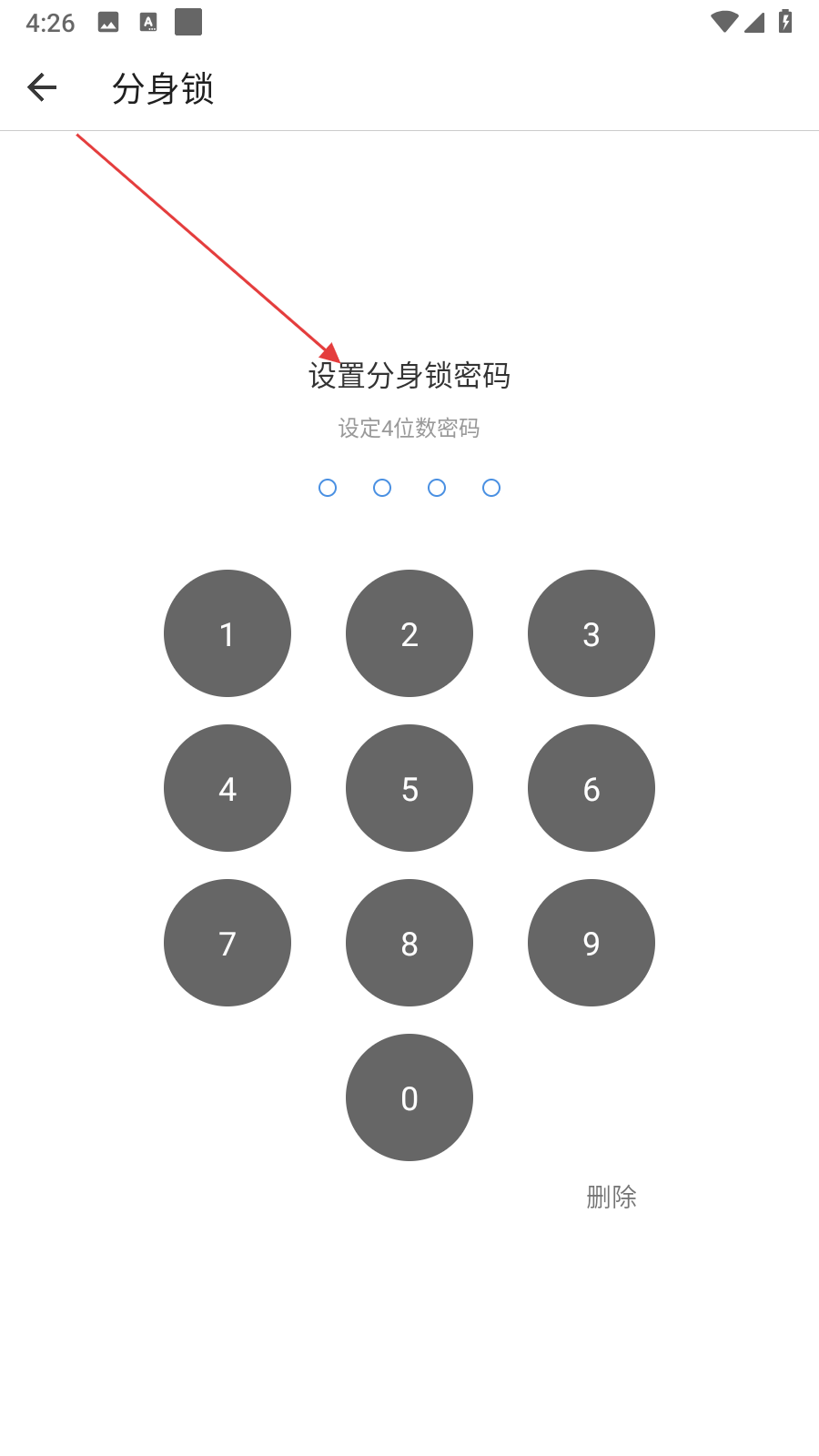 3、点击开关开启分身锁功能后,会进入设置分身锁密码界面,按照提示设定4位数密码,输入完成后即成功开启分身锁。