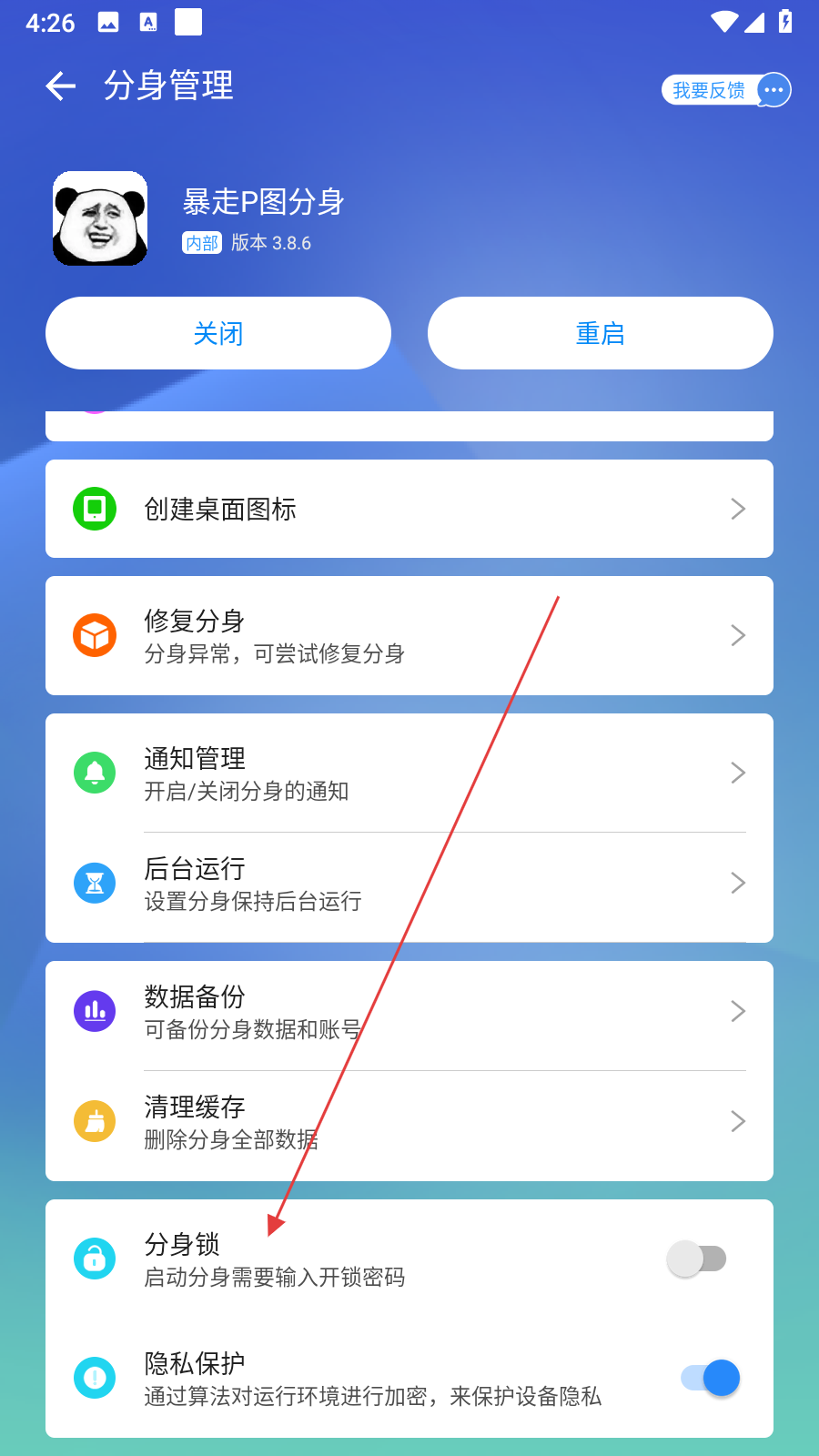 2、在分身管理界面里,向下滑动找到分身锁选项,点击分身锁右侧的灰色开关按钮。