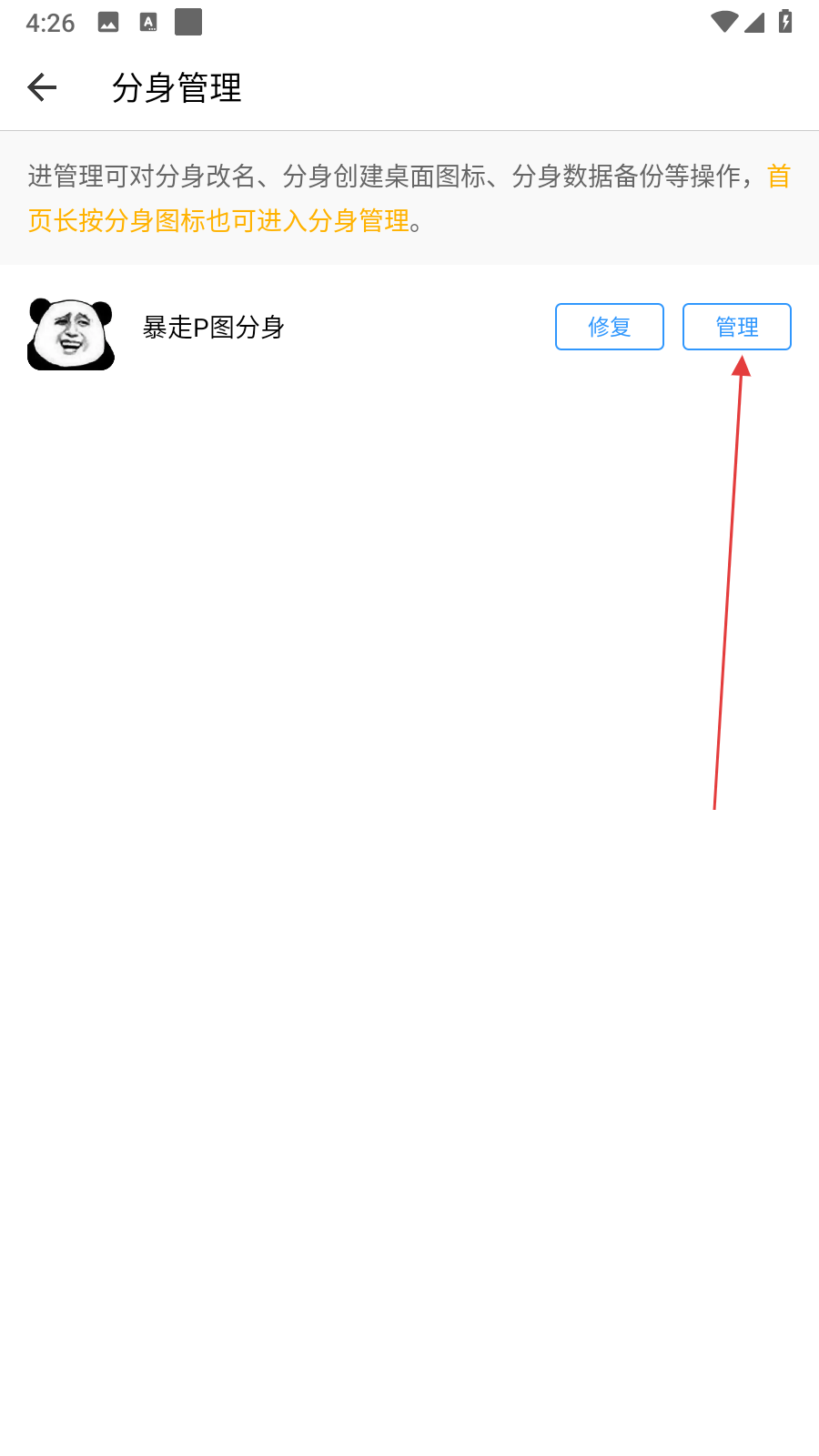 1、进入分身管理页面,找到想要设置分身锁的应用分身,点击其右侧的管理按钮进入该分身的管理界面。