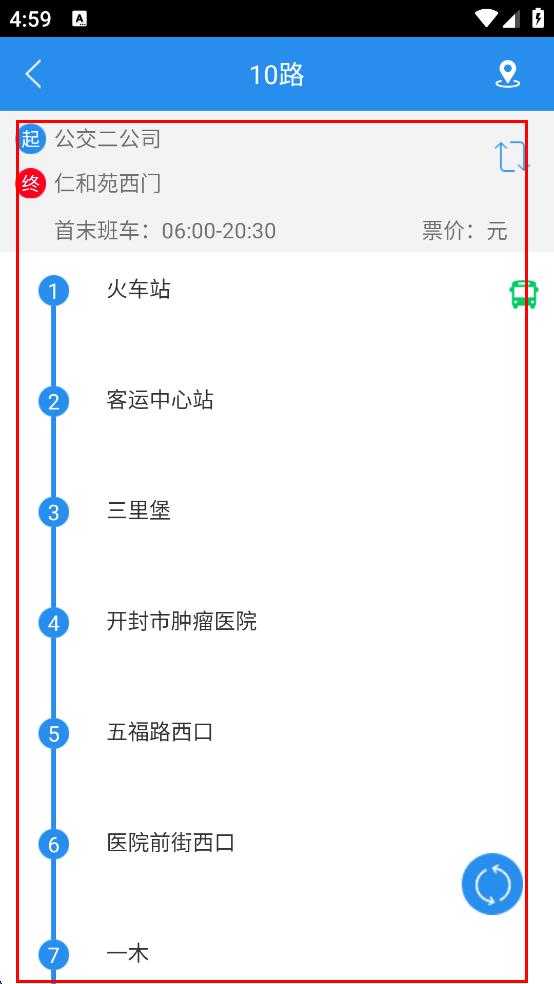 3、点击“10路”后,进入该线路的详情页面,在该页面即可查看“10路”公交的首末班车时间、票价以及站点等详细信息。