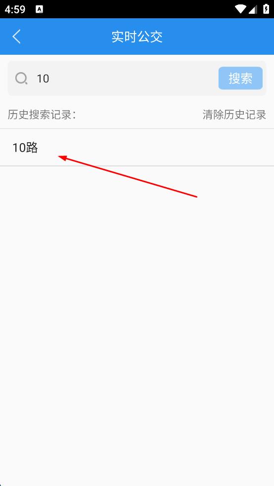 2、在实时公交查询页面,找到搜索框,输入要查询的公交线路,如“10路”,然后点击“搜索”按钮,或者在历史搜索记录中直接点击“10路”。
