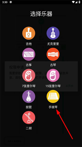 3、进入选择乐器界面后,可看到有多种乐器选项,点击想要切换的乐器如手拨琴。