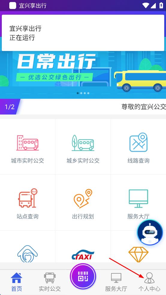1、打开宜兴享出行APP,在首页点击右下角“个人中心”选项,进入个人中心页面。
