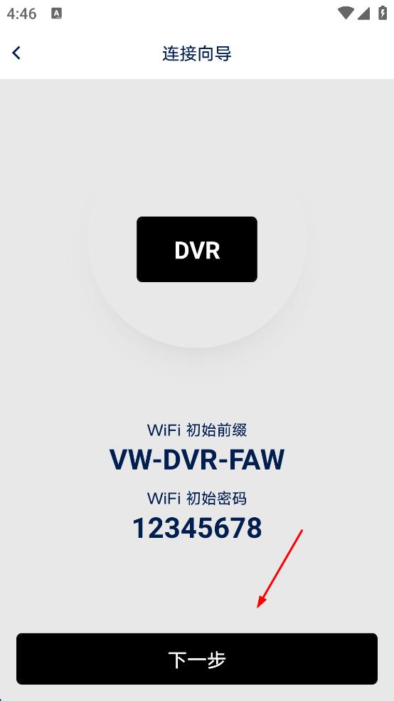 2、在连接向导页面,查看WiFi初始前缀和初始密码等信息,然后点击“下一步”按钮。