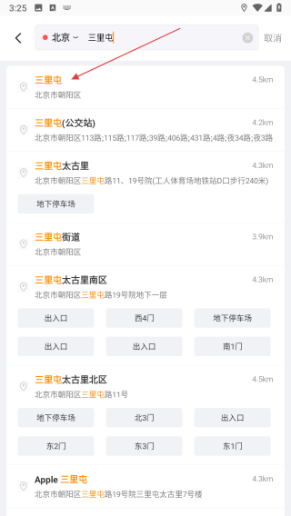 3、从系统推荐的地点列表中,选择准确的目的地。
