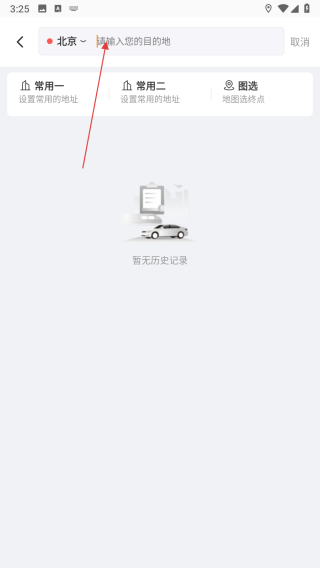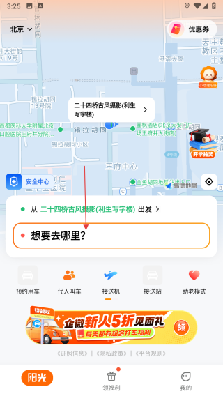 1、打开阳光出行APP,在首页点击想要去哪里?的输入框,进入目的地设置页面。