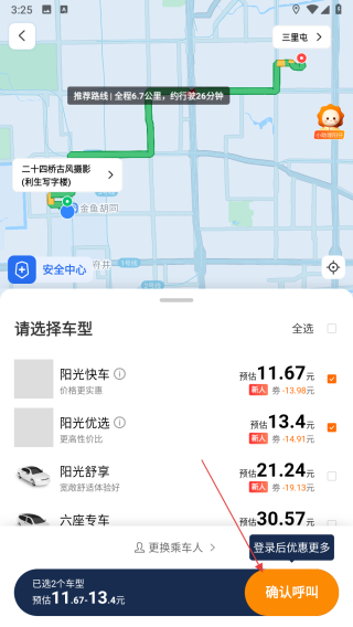 4、选择好目的地后,系统会展示可选车型及预估价格,选择心仪车型后,点击确认呼叫按钮,等待司机接单。
