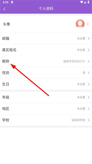 3、在个人资料页面中,点击昵称选项,进入昵称修改页面。