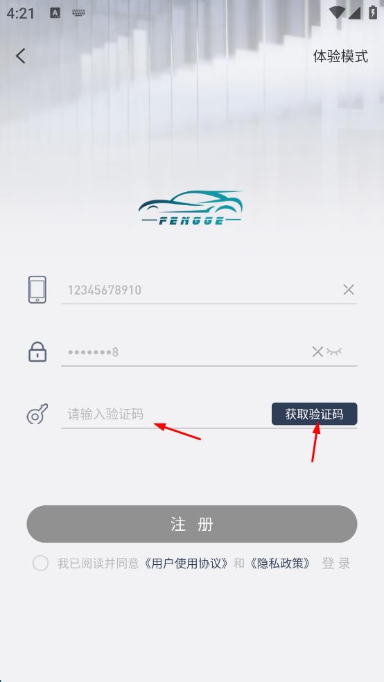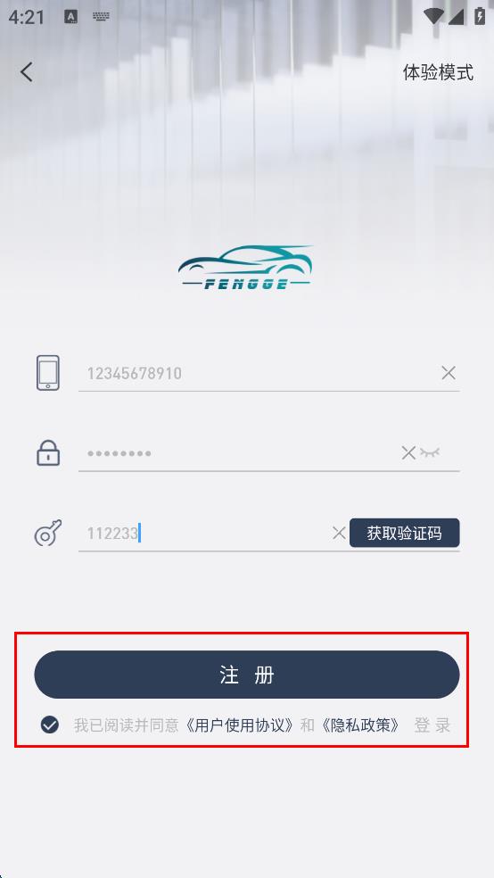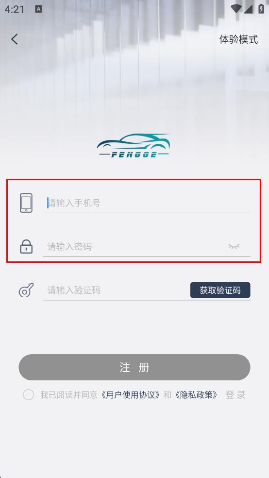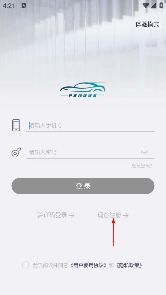 1、打开“FENGGE”APP,在登录界面点击“现在注册”选项,进入注册页面。