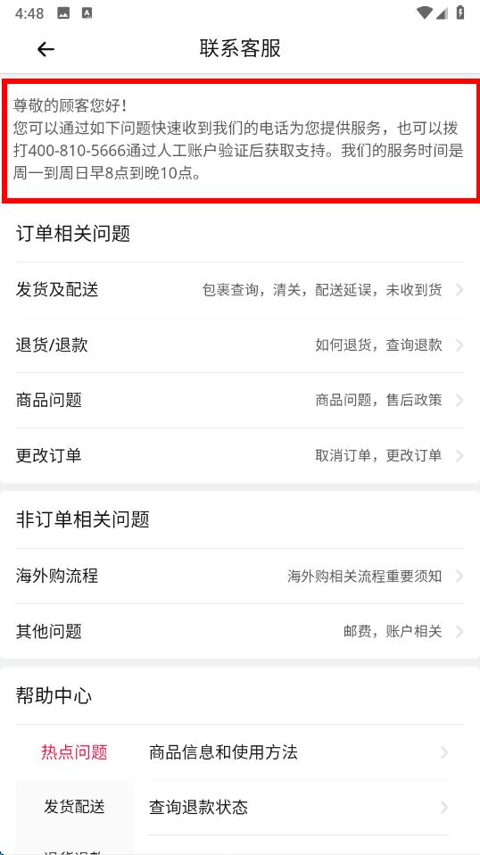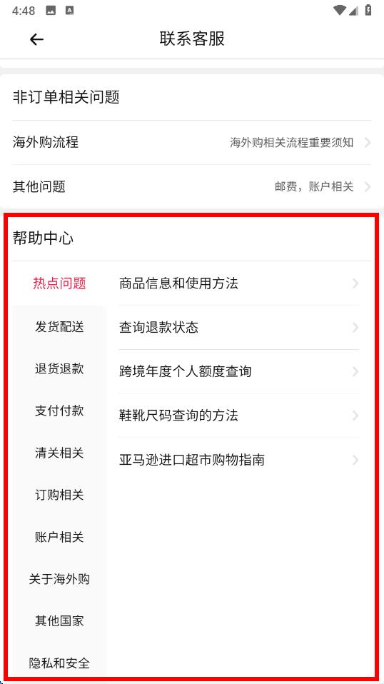 4、此外,还能在联系客服界面的帮助中心,查看热点问题及各类相关问题的解答,获取帮助。