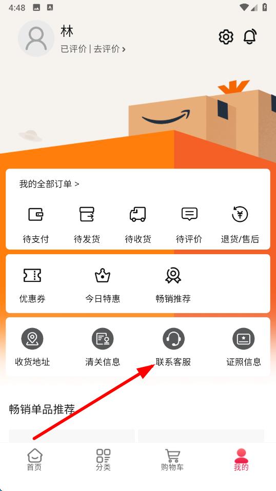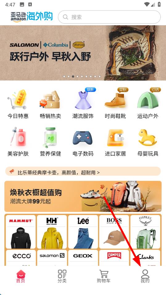 1、打开亚马逊海外购app,点击底部导航栏最右侧的我的选项,进入个人页面。