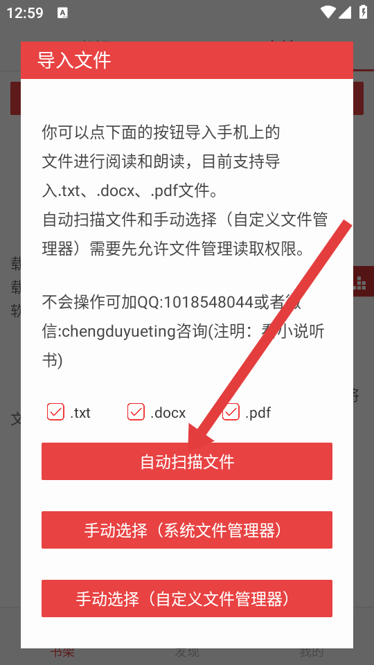 2、在导入文件选项窗口中,点击自动扫描文件的按钮,触发存储权限请求弹窗。