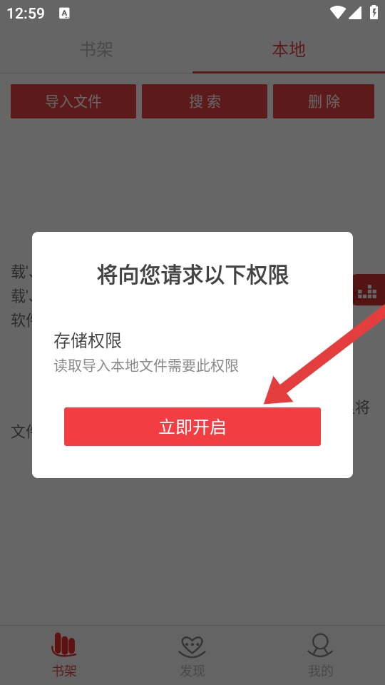 3、在存储权限请求弹窗中,点击立即开启的按钮,授予应用存储权限。