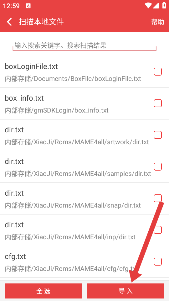 4、进入扫描本地文件页面后,勾选要导入的文件,点击导入按钮,完成文件导入操作。
