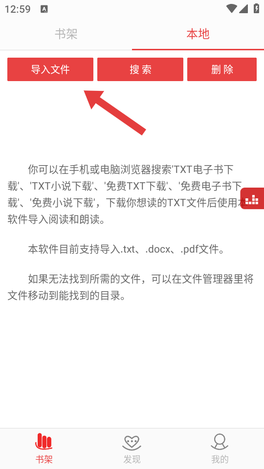 1、在看小说听书的本地页面,点击导入文件的按钮,弹出导入文件选项窗口。