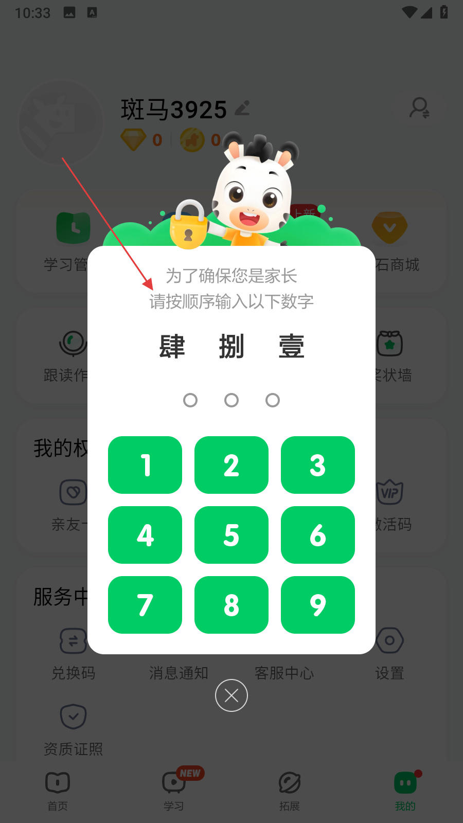 2、按弹窗提示,请按顺序输入数字,输入对应数字完成家长验证。