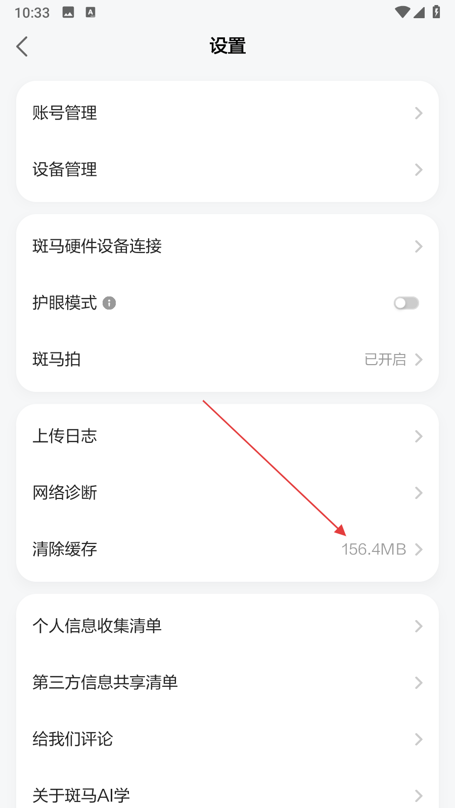 3、进入设置界面后,点击清除缓存选项,此时会显示当前缓存大小。