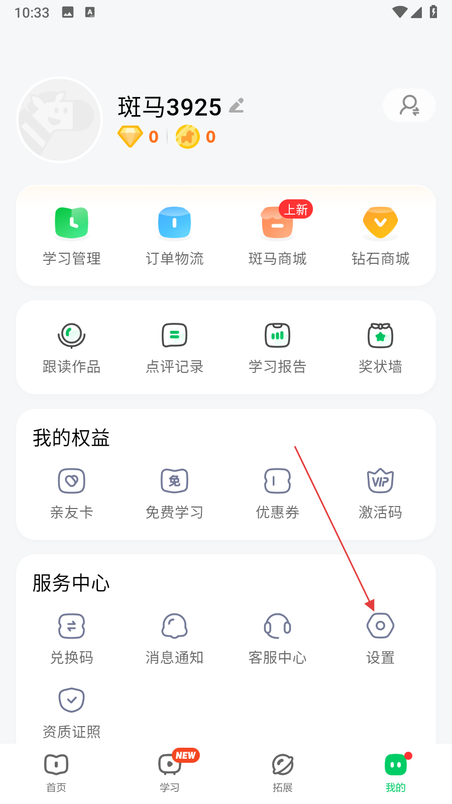 1、打开斑马英语APP,在个人页面中,找到并点击设置选项。