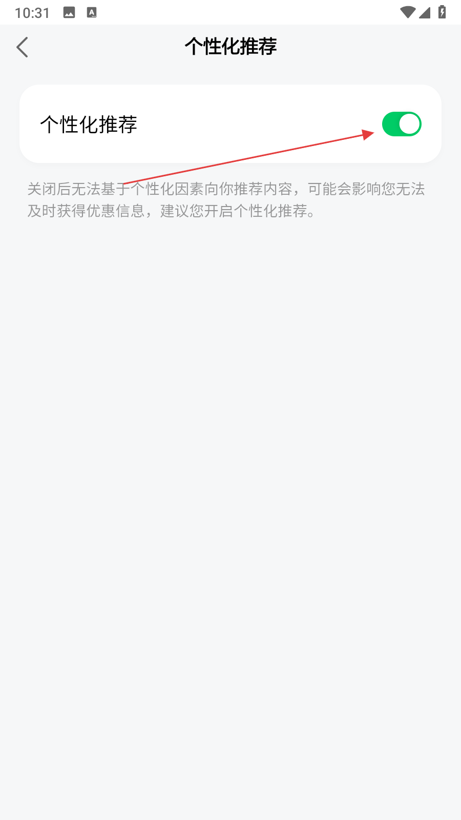 4、进入隐私设置界面后,找到个性化推荐选项,点击其右侧的开关按钮,将其关闭。