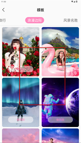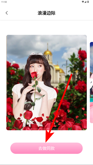 3、点击选中模板下方的做同款或去做同款按钮,按提示操作上传照片或进行拍摄,即可生成带有特效的照片。