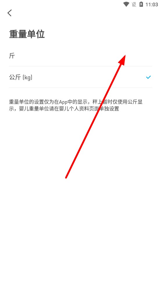 3、在重量单位页面,选择「斤」,即可将APP内显示的体重单位切换为斤,仅影响APP端展示。