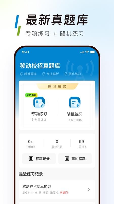 移动校招真题库是一款专门给移动校园招聘打造的学习软件,软件收录了海量的考试题目,用户在线就可以学习,有新考试大纲和重点解析,能够帮助用户更好的学习,还有考试真题与训练资源,采用智能推荐算法,能够给用户推送薄弱环节的题目,让用户攻克各个难题,软件按知识点、题型分类练习,多种不同的题型,在线就可以刷题,还有丰富的面试技巧可以学习。