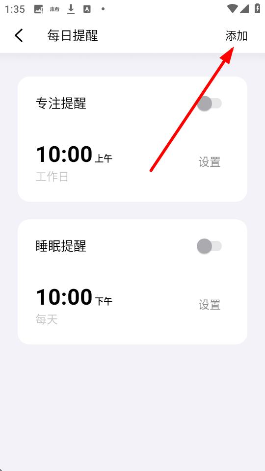 4、在每日提醒页面,点击右上角的添加按钮,在添加提醒页面设置,点击保存,即可完成时间限制相关设置。