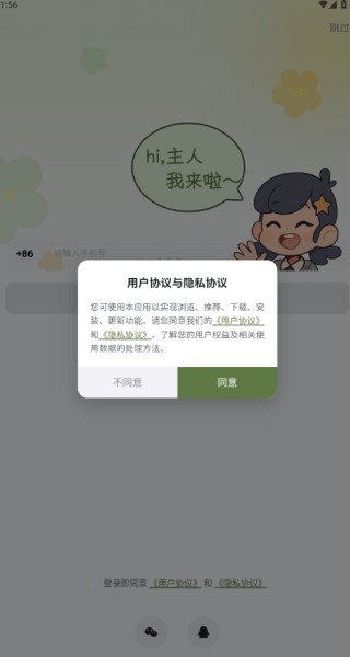2、跳转到登录界面,会弹出用户协议和隐私协议,点击同意并继续;