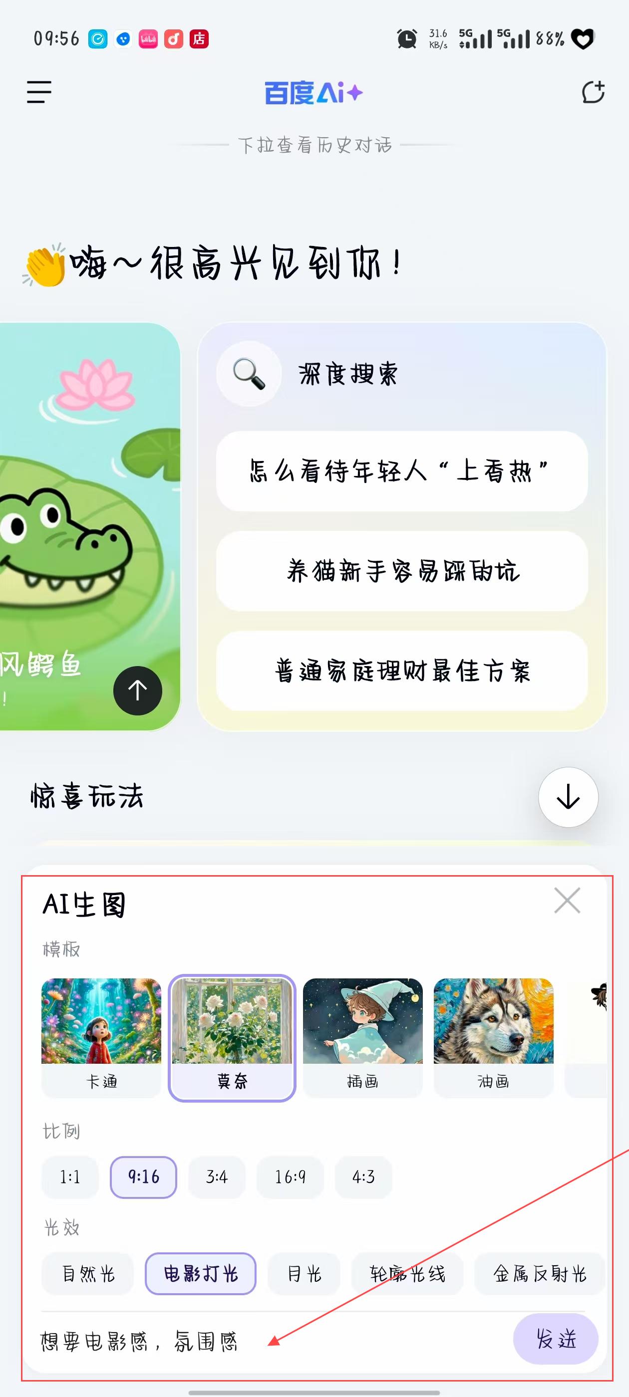 2、进入AI生图设置区域,选择图片模板,接着设置图片比例,再选择光效,像自然光、电影打光等,然后在输入框中输入对生成图片的具体要求,完成后点击发送。