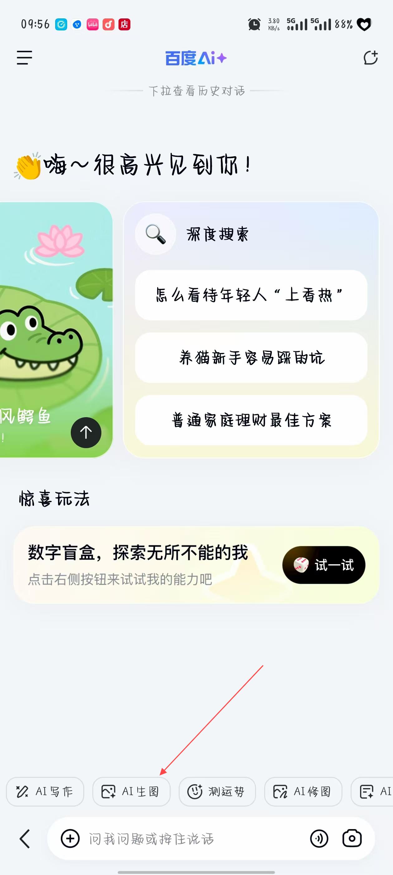 1、打开百度APP,点击底部导航栏中的AI+进入AI功能界面,在下方功能按钮中找到并点击AI生图。
