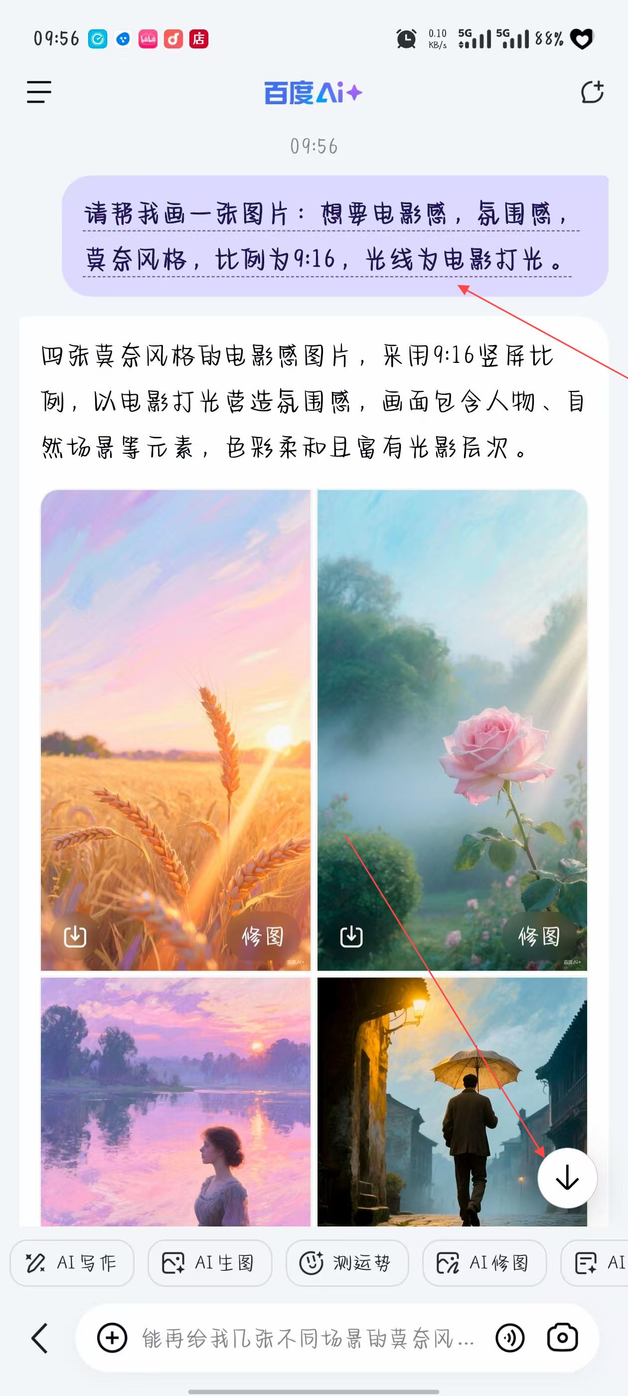 3、AI会根据设定的要求生成图片,生成完成后,浏览生成的图片,点击图片下方的下载图标,即可将喜欢的图片保存到手机。