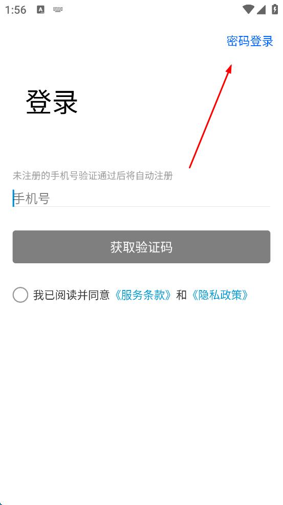 1、打开APP,进入登录页面后,点击页面右上角“密码登录”选项。