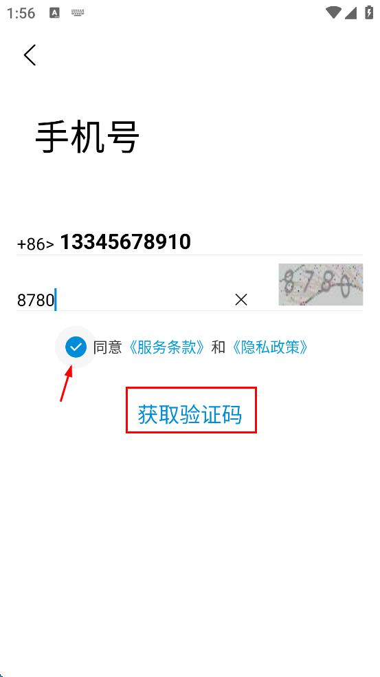 4、勾选同意服务条款和隐私政策,然后点击“获取验证码”,等待后续操作。