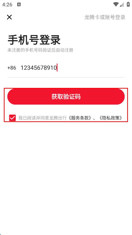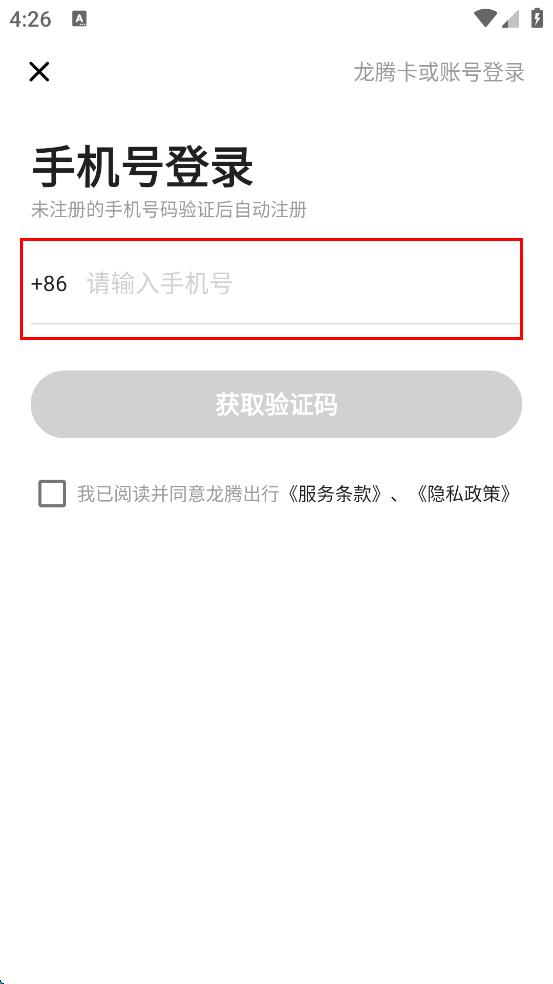 3、进入手机号登录页面,在输入框输入手机号,勾选同意政策,点击“获取验证码。