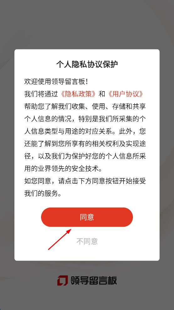 1、打开领导留言板App,出现个人隐私协议保护弹窗,阅读后点击同意按钮。