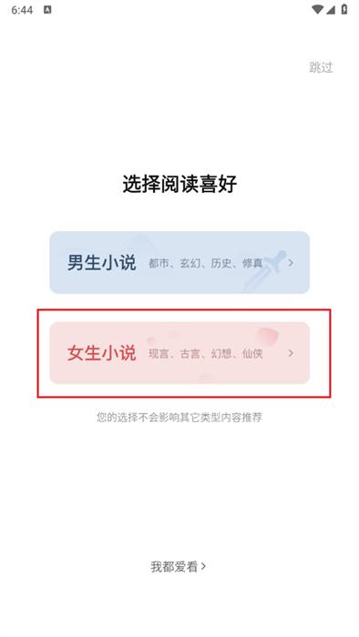 1、进入到软件之中后,用户可以进行小说类型的选择,小编将会以【女生小说】为了来进行演示;