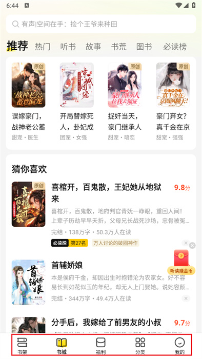 语音朗读功能提供多种声音任你选择,满足你的听书需求,解放双眼,随时随地听小说,海量小说免费听!