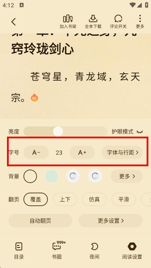 3、在阅读设置页面,找到字号选项,点击A-可缩小字体,点击A+可放大字体,也能点击字体与行距进行更细致的字号以及行距设置,调整到适合自己的字体大小。