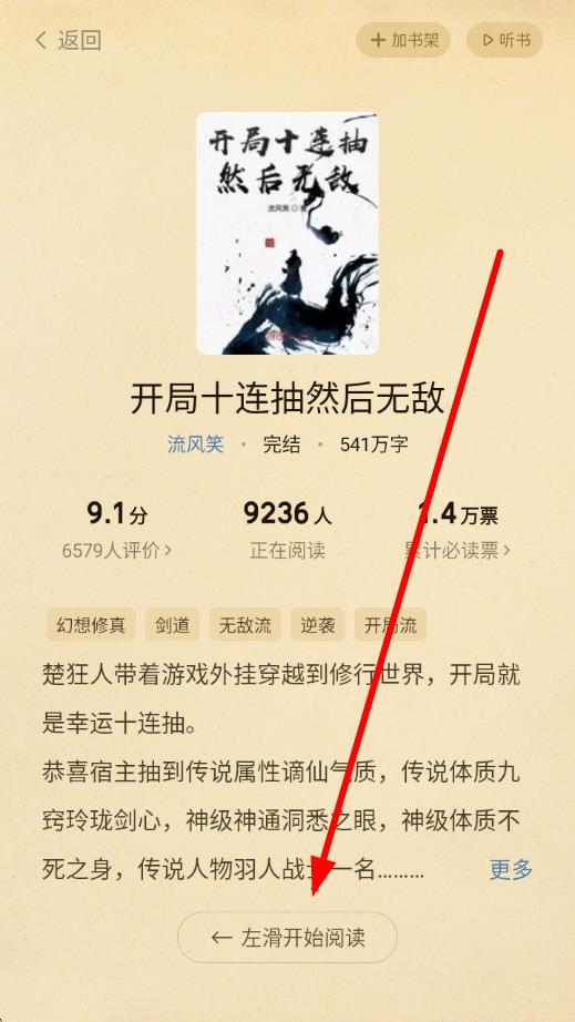 1、打开七猫小说APP,找到想阅读的小说,如开局十连抽然后无敌,点击左滑开始阅读进入小说阅读界面。