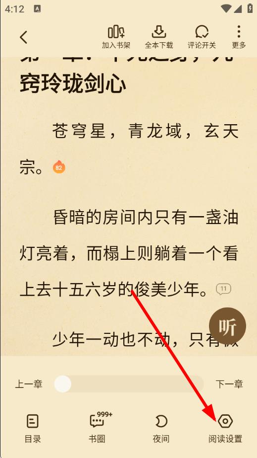 2、在小说阅读界面中,点击屏幕右下角的【阅读设置】按钮,进入阅读设置相关页面。