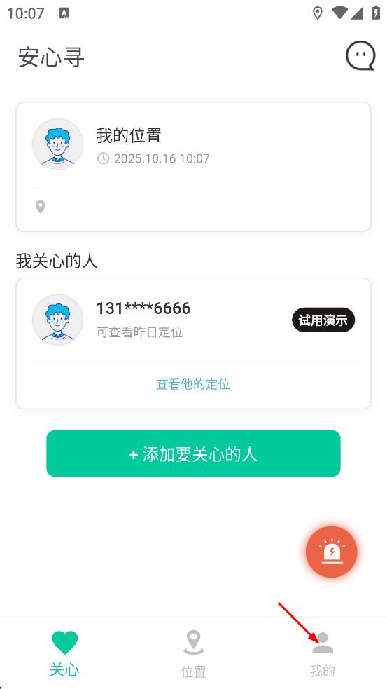 1、打开安心寻应用,在界面底部找到“我的”选项,点击进入个人页面。