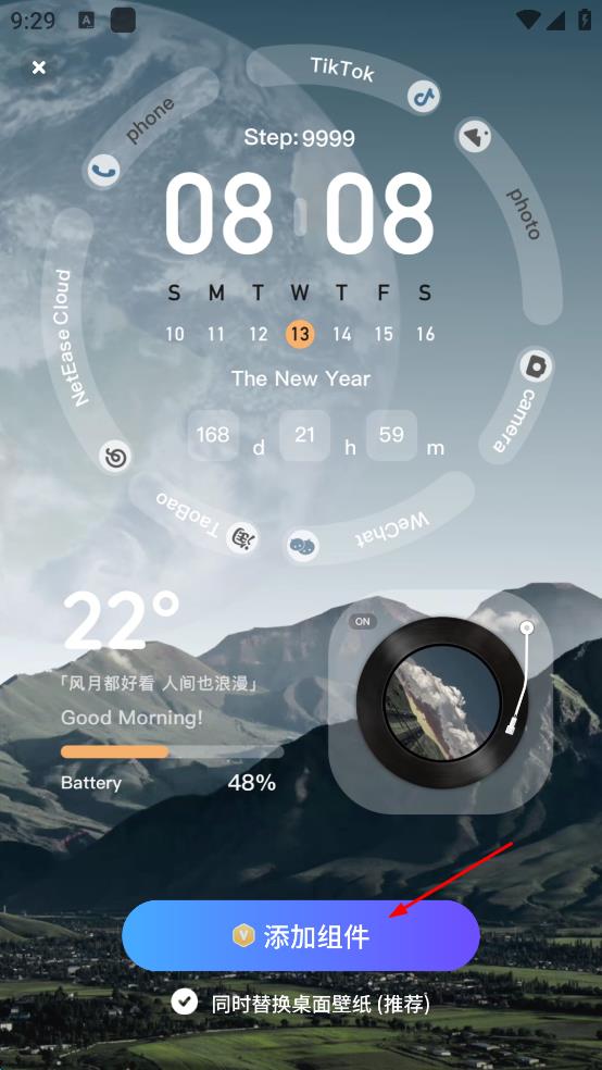 4、在组件详情页面,点击添加组件按钮,若想同时更换桌面壁纸,可勾选同时替换桌面壁纸推荐,完成组件添加操作。