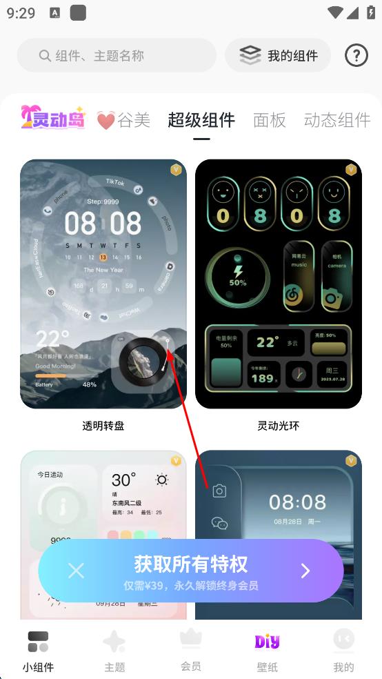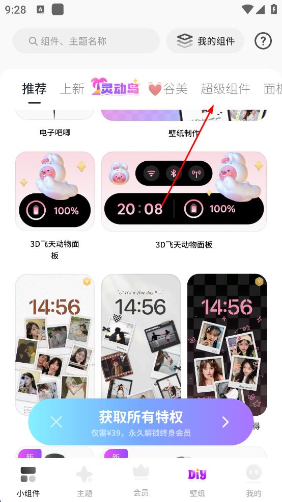 2、在应用主界面,点击上方的“超级组件”选项,进入到超级组件展示页面。