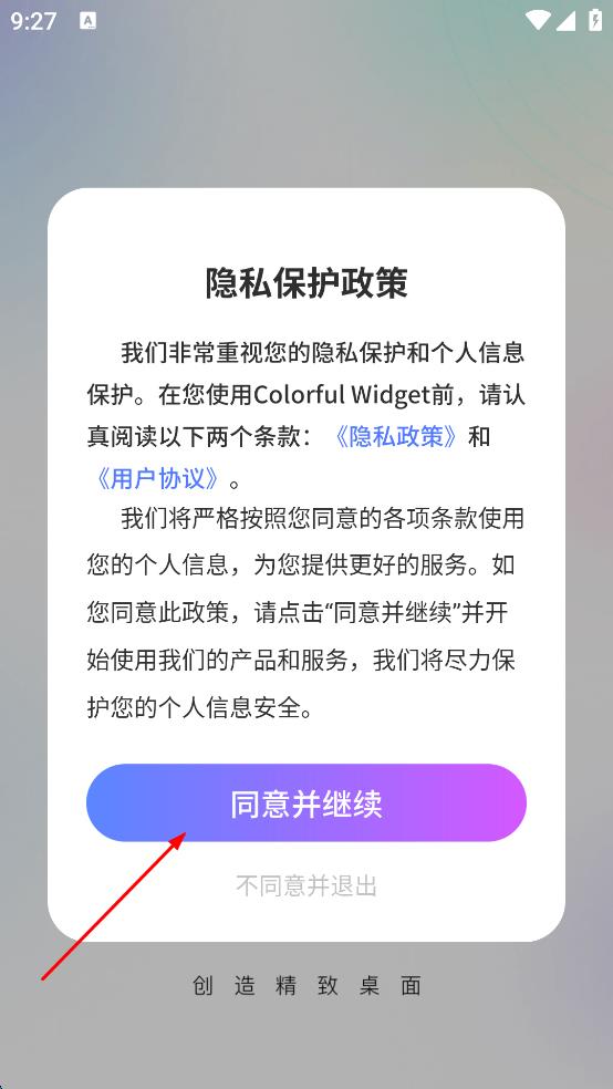 1、打开Colorful Widget应用,会弹出隐私保护政策说明框,认真阅读后点击“同意并继续”,进入到应用主界面。