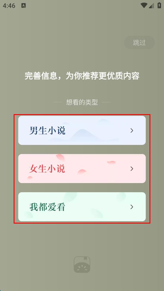 2、在完善信息页面,选择想看的小说类型,比如男生小说、女生小说或我都爱看,以便APP推荐更优质内容。