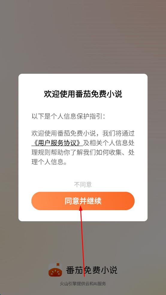 1、打开番茄免费小说APP,在欢迎使用界面,仔细阅读个人信息保护指引后,点击同意并继续,进入完善信息页面。
