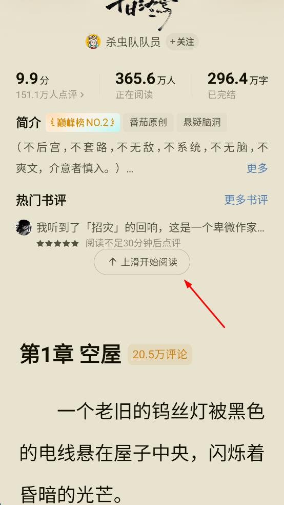 4、在小说详情页面,可查看小说评分、简介、热门书评等信息,点击上滑开始阅读,沉浸到小说内容中。